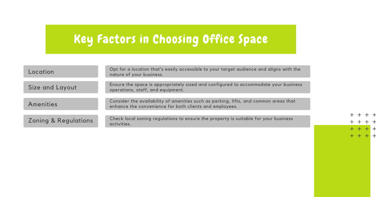 Selecting the right office space is pivotal to the success of your business. Here are essential factors to consider: