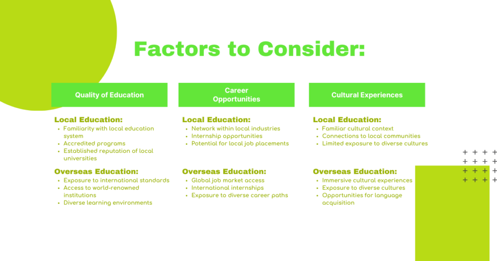- Set Clear Goals: Define your educational goals and aspirations for your child. Determine whether local or overseas education aligns better with those goals.